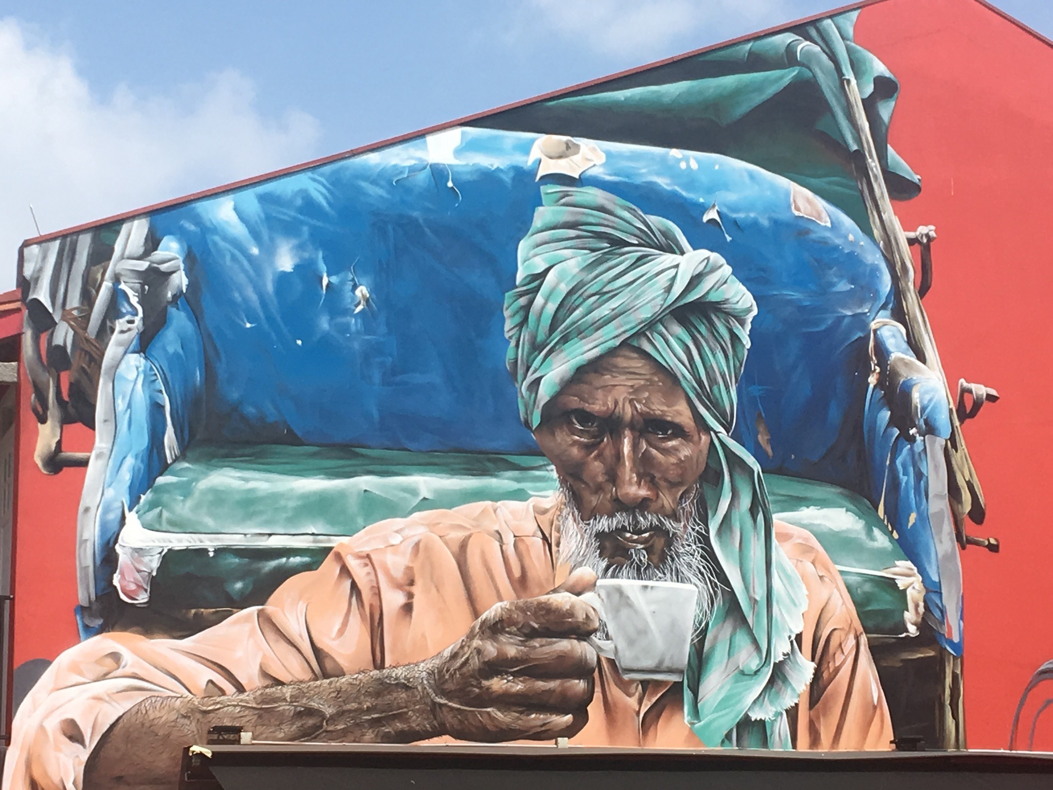 • beautiful mural of a man drinking coffee or tea