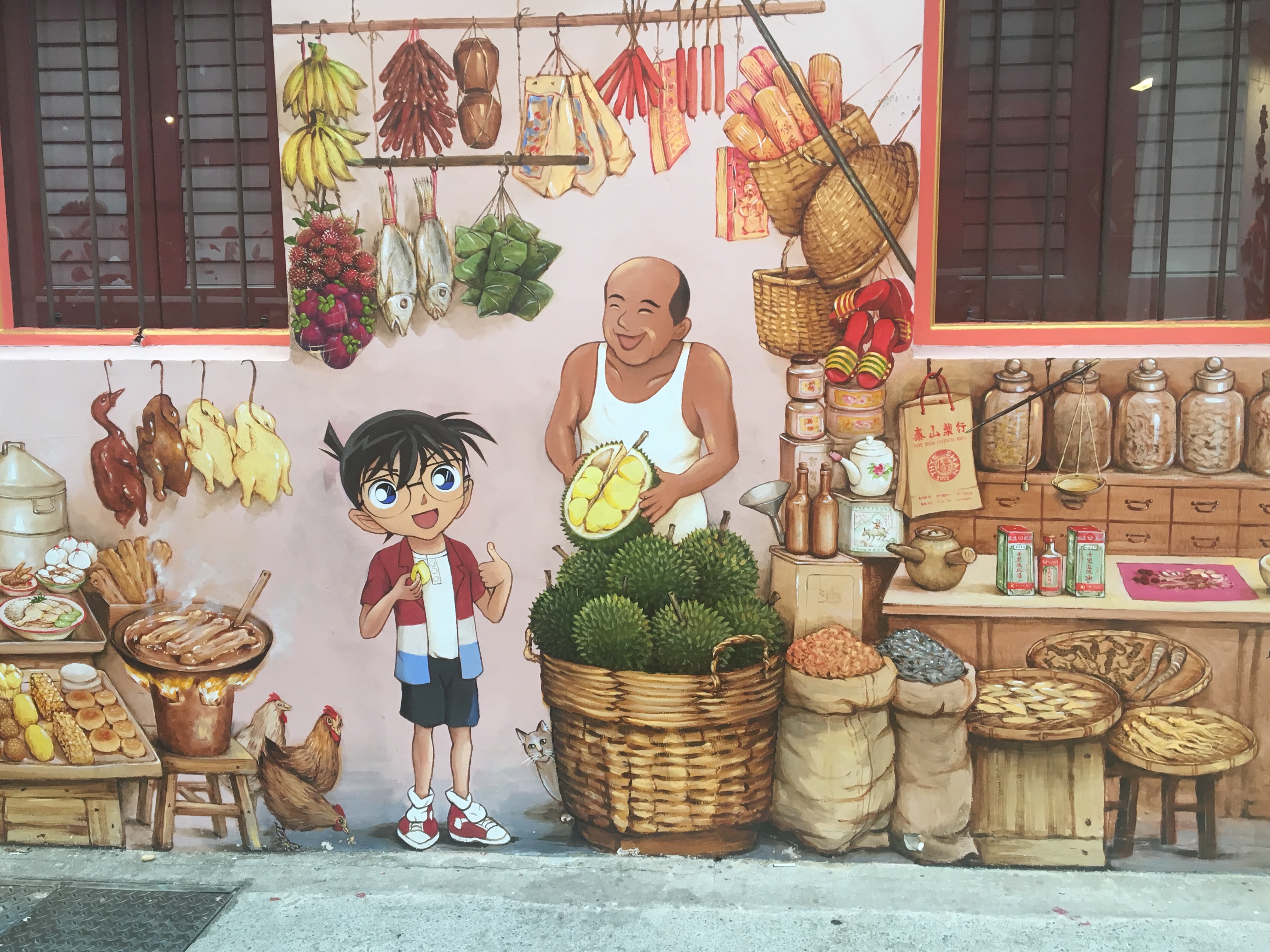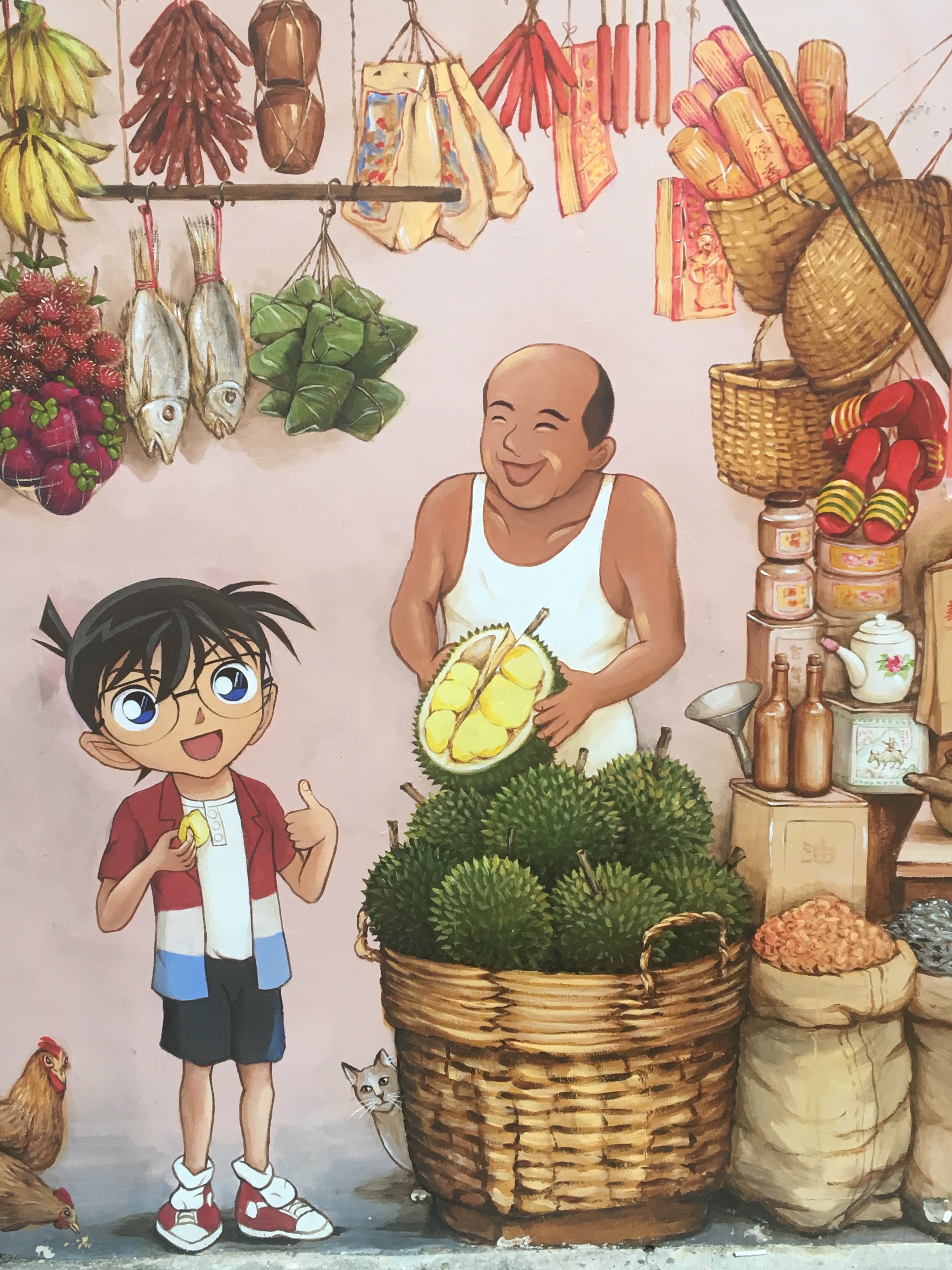 • street art in Singapore of a boy eating durian