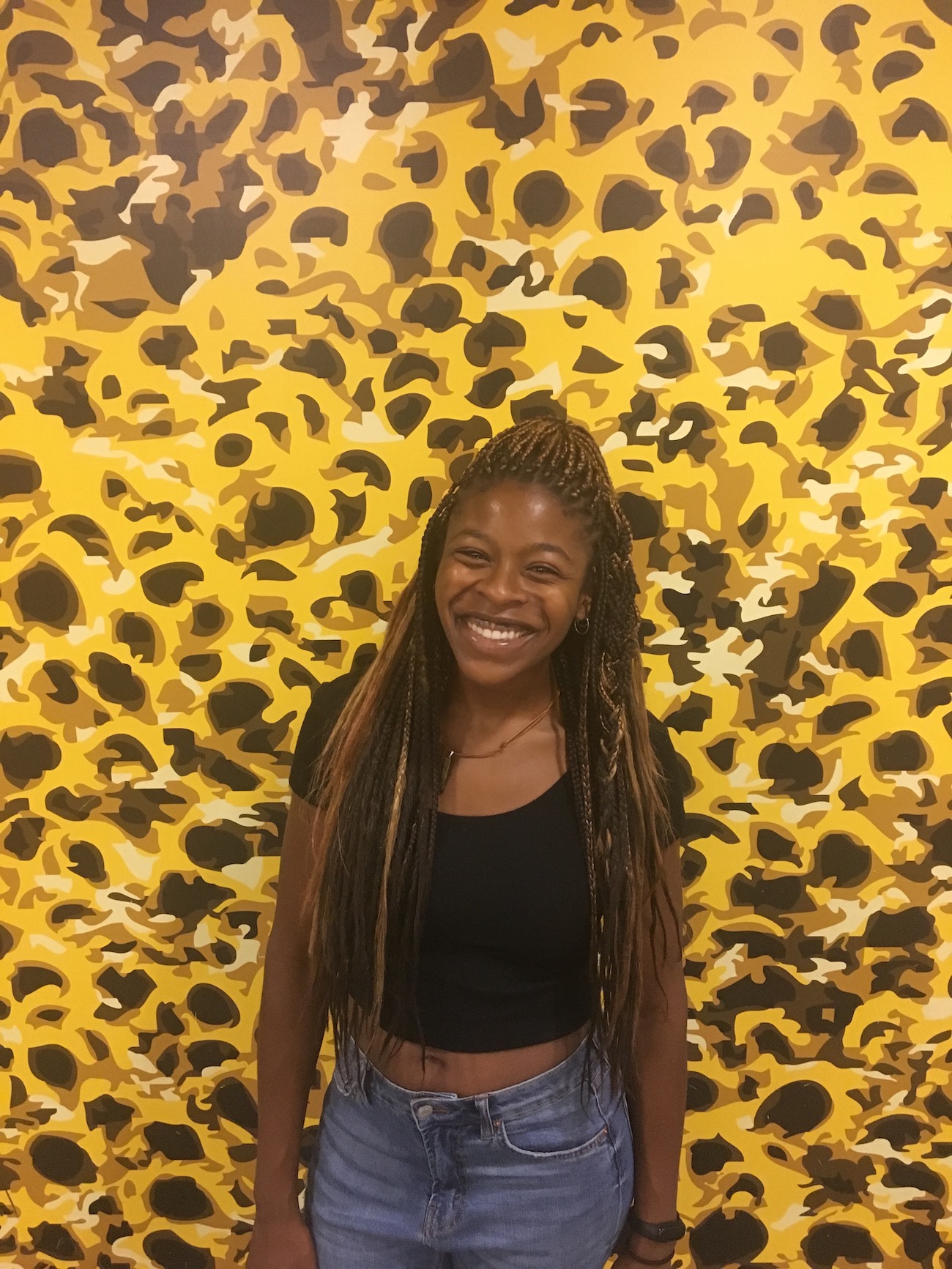 • Me smiling in front of a painted wall of sunflowers