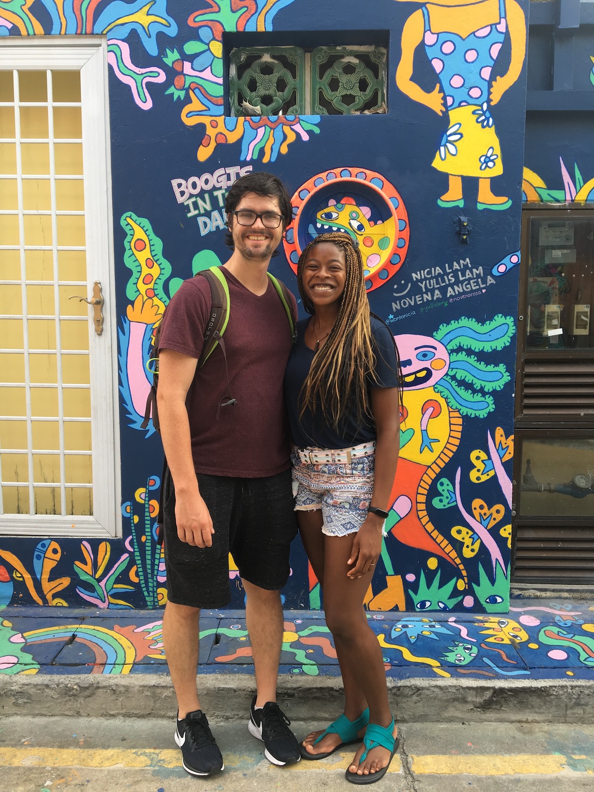 • Evan and I smiling in front of street art in Singapore